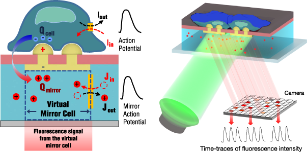 Concept of the Virtual Mirror Cell. The action potentials of neurons and cardiomyocytes are responsible for the movement of charged fluorophores in the microfluidic chamber beneath the cell culture. The movement of the fluorophores is detected with high spatial resolution by a camera. A. Barbaglia et al., Advanced Materials, 2021